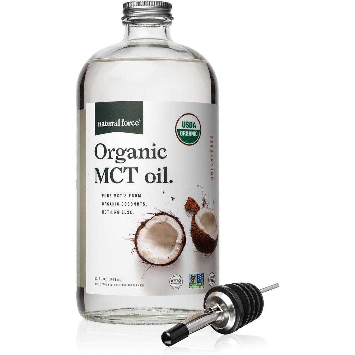 Natural Force Organic MCT Oil – Pure Glass Bottle – Made from 100% Cold Pressed Virgin Coconut Oil + Certified Keto, Paleo, Kosher, Vegan & Non-GMO – Lab Tested for Quality and Purity - 32 Ounce