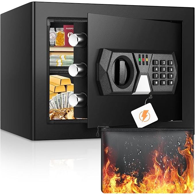 Ideal for home or office use, this security safe box offers peace of mind knowing that your valuable possessions are safely stored and protected from unauthorized access, as well as potential damage from fire or water. The compact and durable design of the safe makes it a practical and convenient security solution for your most cherished belongings. Description by ChatGPT.